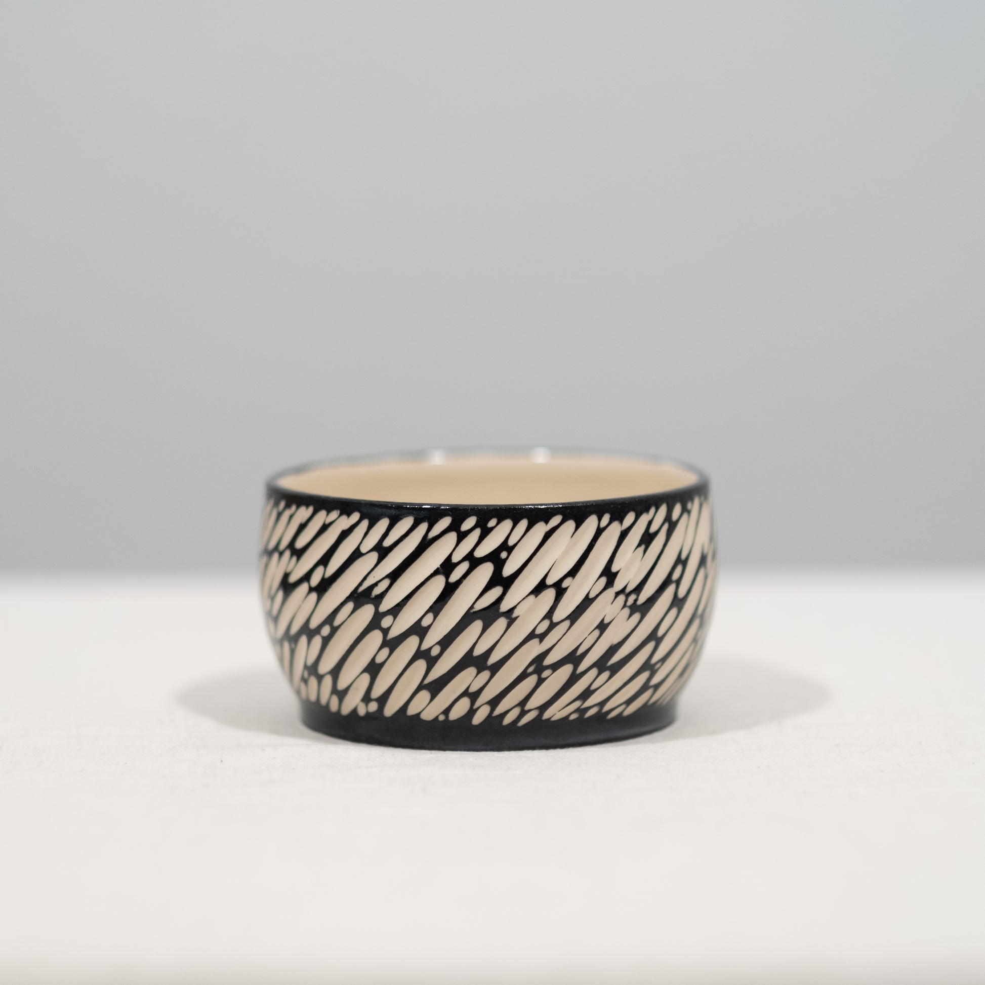 This bowl was thrown on the pottery wheel, then decorated with a black slip. When it was dry enough to handle, the design was carved by hand using the sgraffito technique revealing the contrasting clay underneath. It was then fired in the kiln at 2170°F.