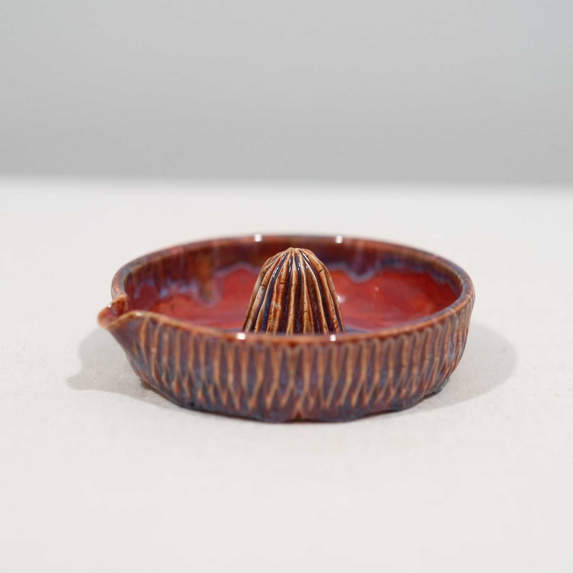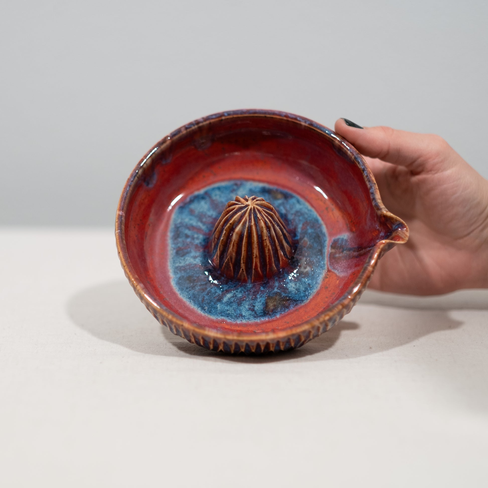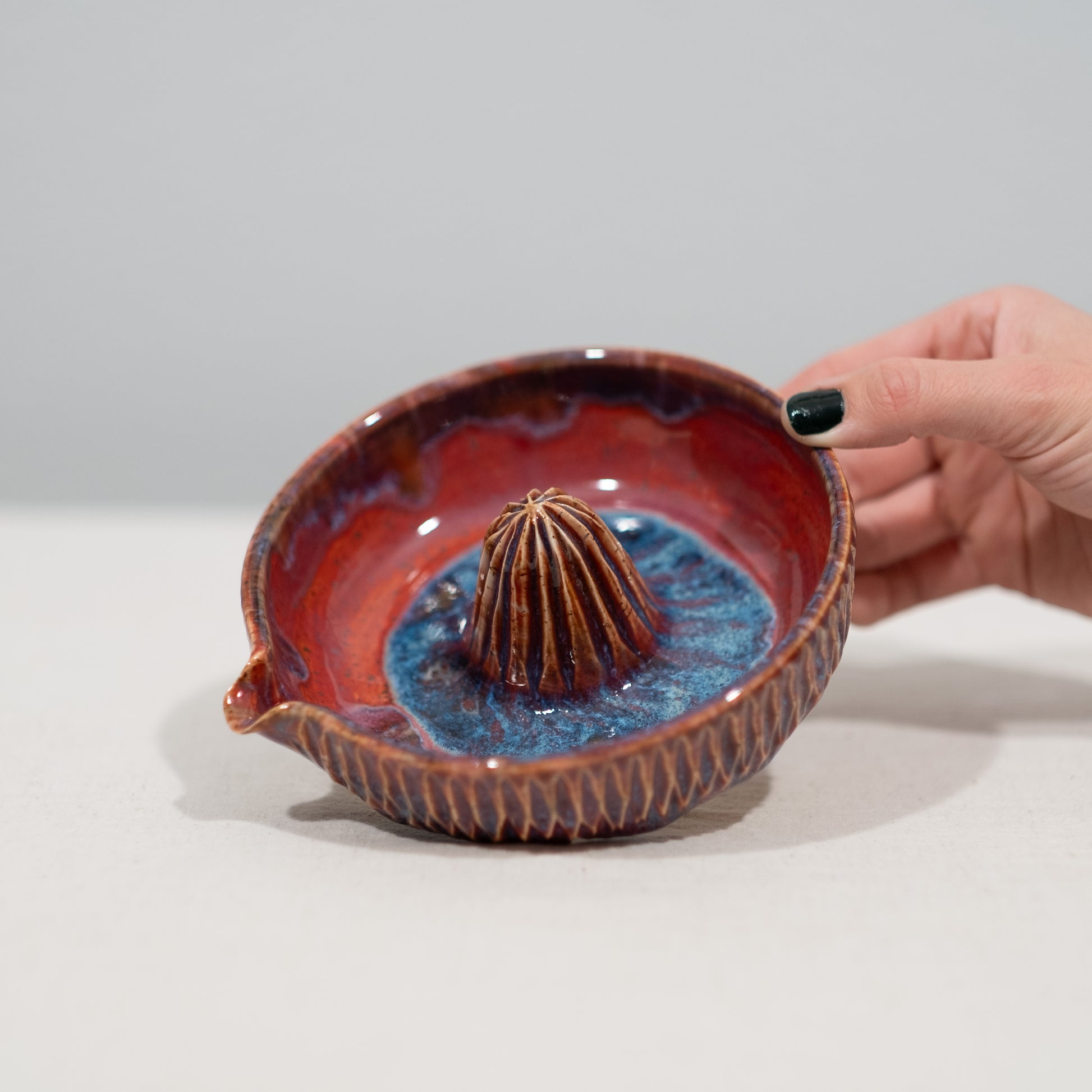 This juicer was thrown on the pottery wheel, the design was carved by hand, and then fired in the kiln at 2170°F.