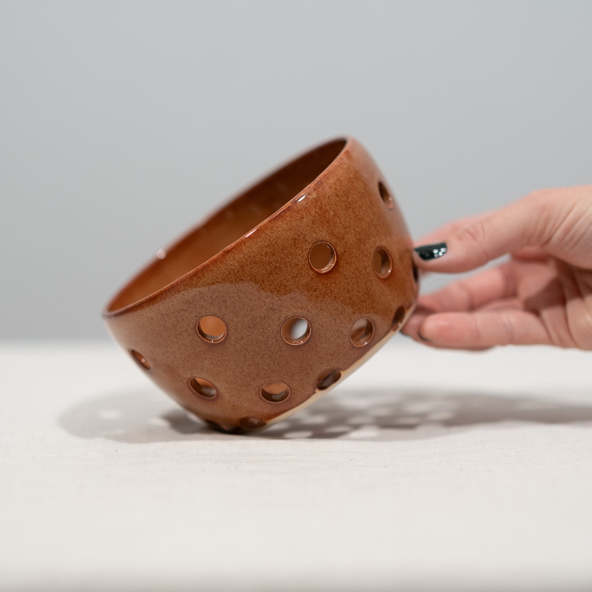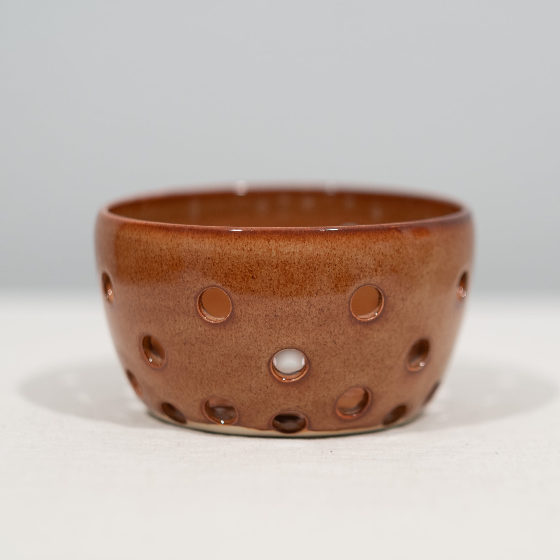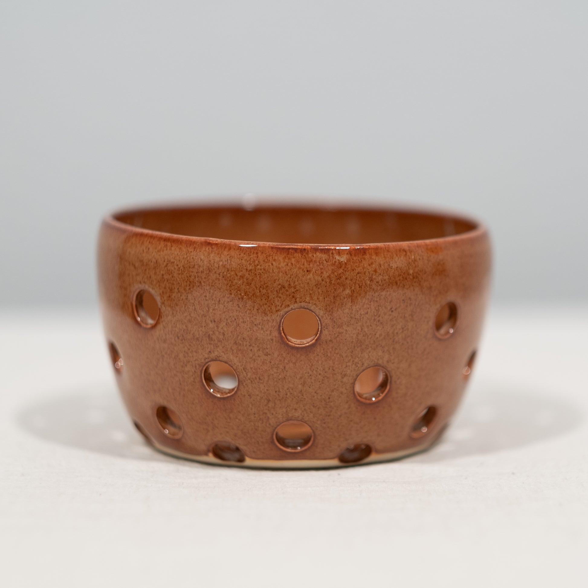 This berry bowl was thrown on the pottery wheel and finished by hand carving the drainage holes, then fired in the kiln at 2170°F.