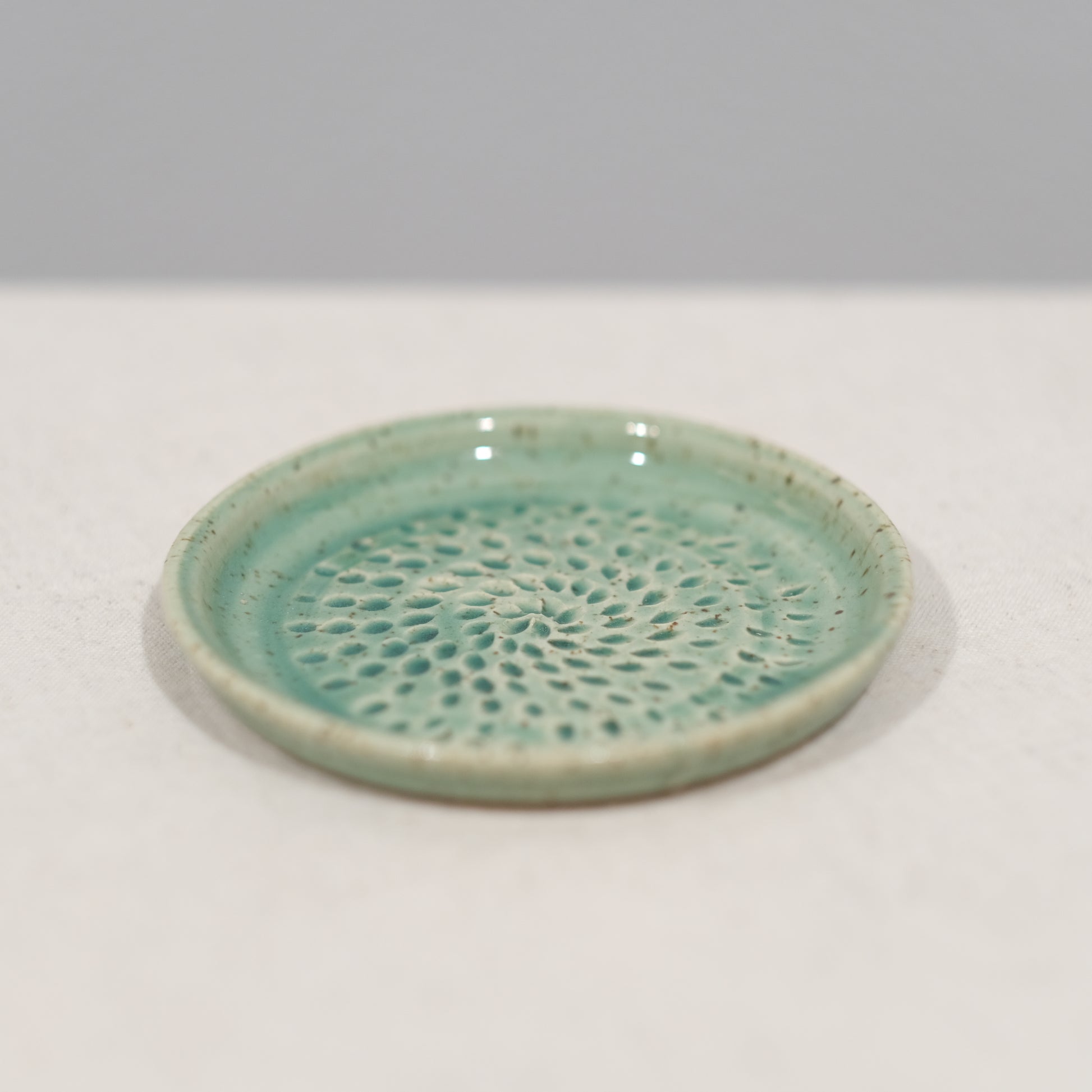 This grater plate was thrown on the pottery wheel, the design was created by hand, and then fired in the kiln at 2170°F.