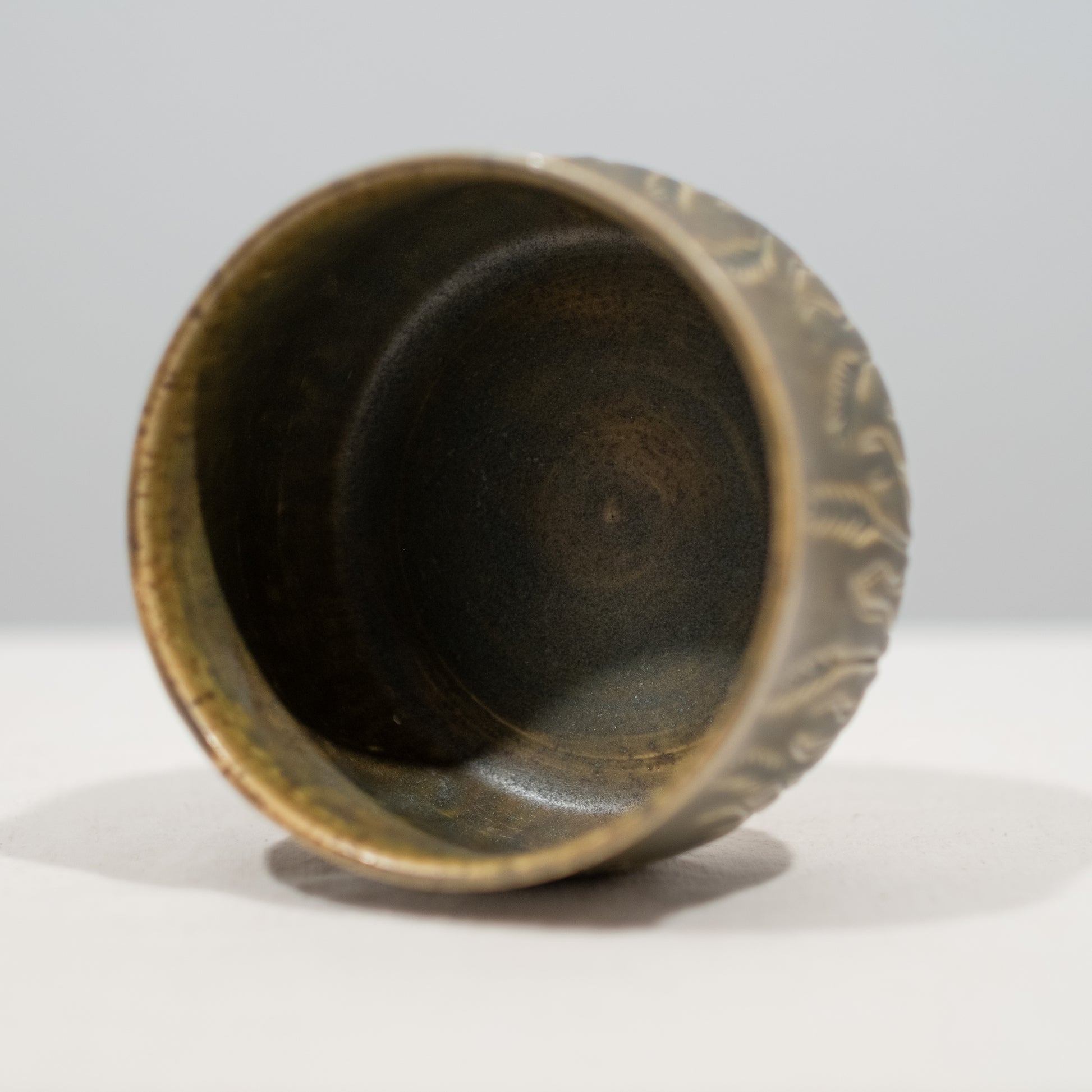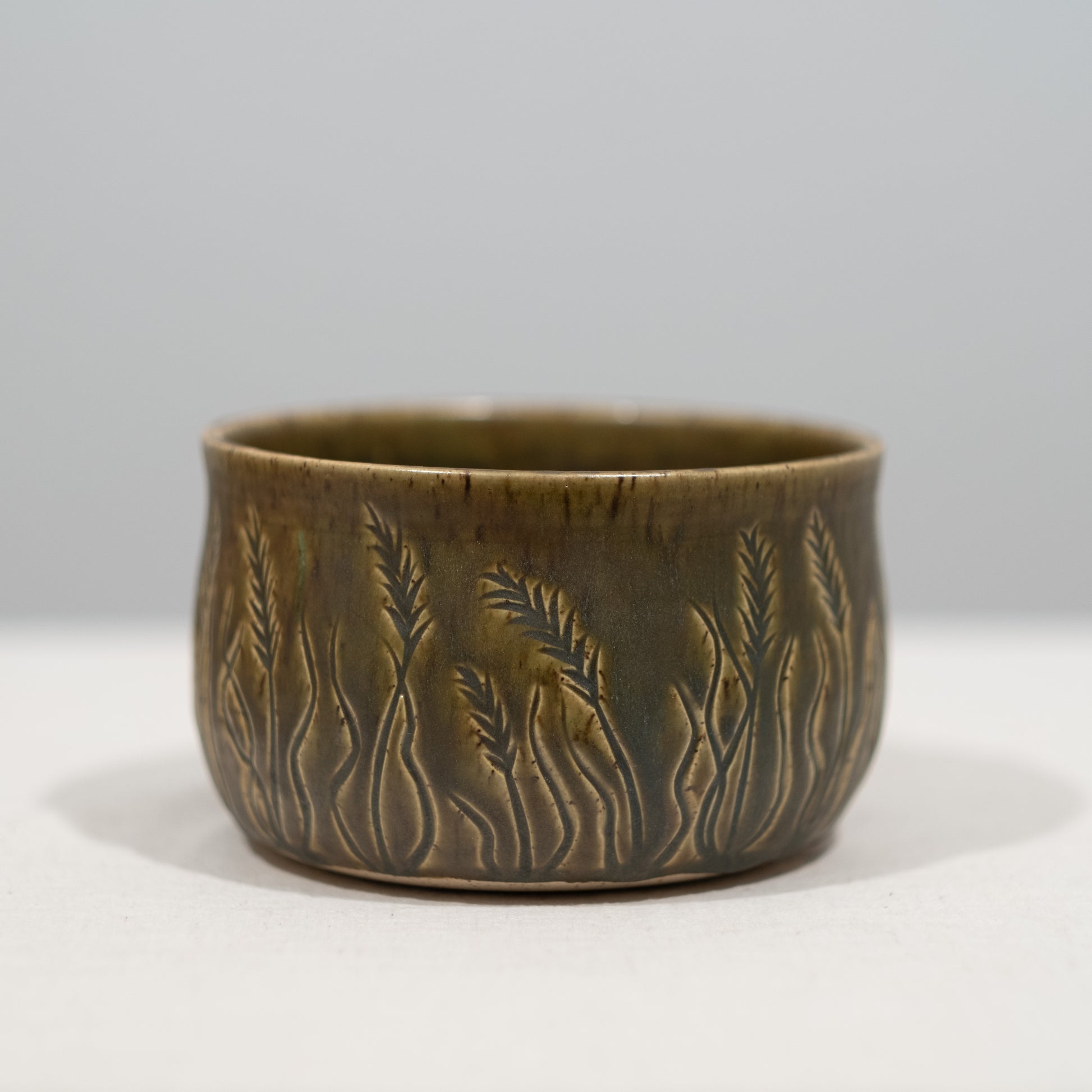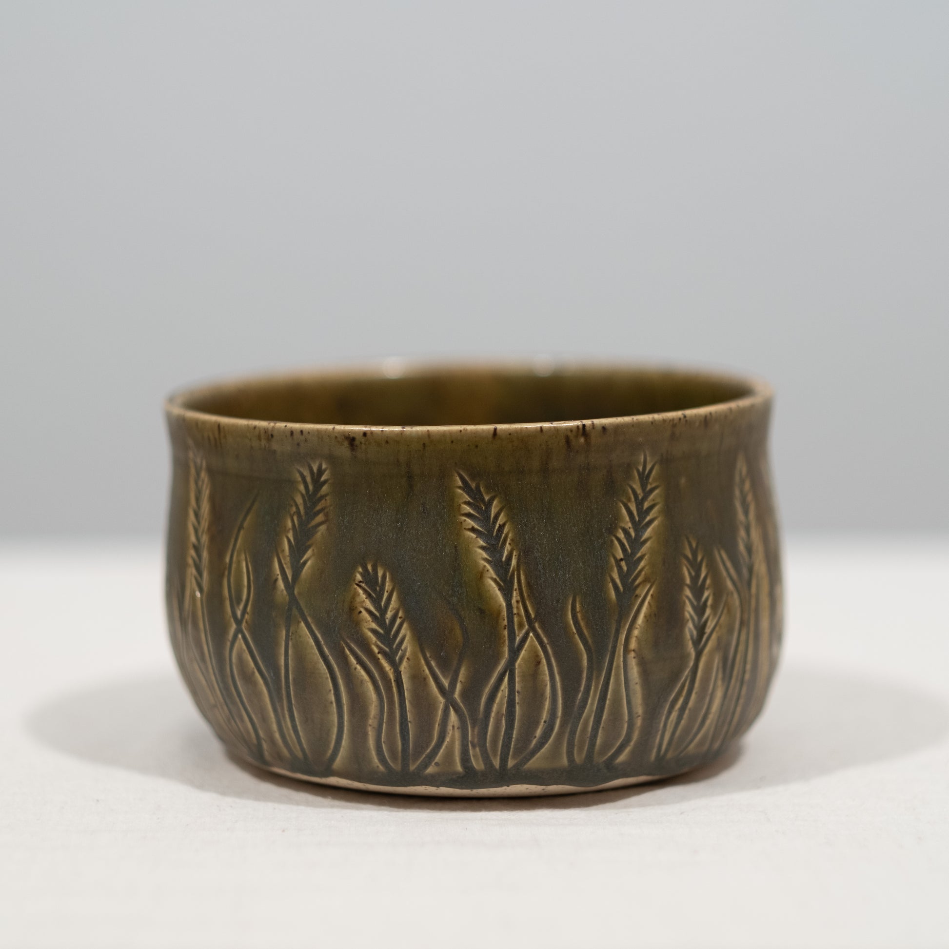 The clay is a warm ivory colored ceramic stoneware with dark speckles. The dark green glaze was applied by hand, and highlights the hand carved design.
