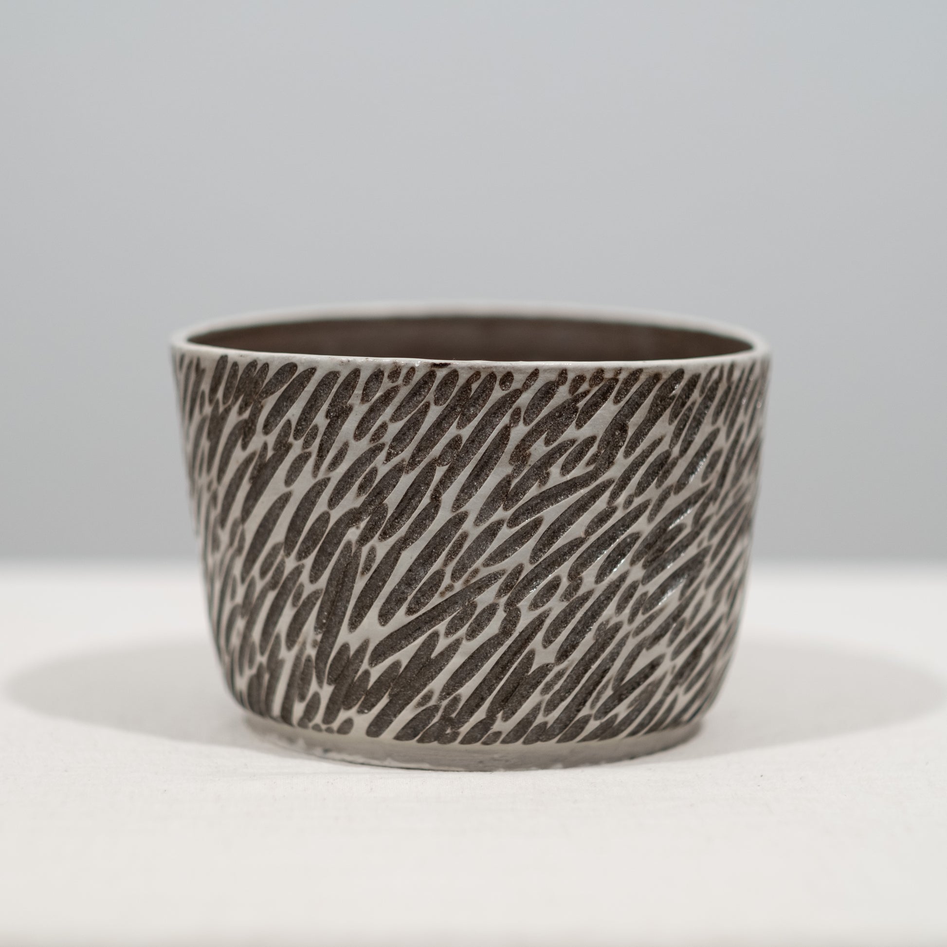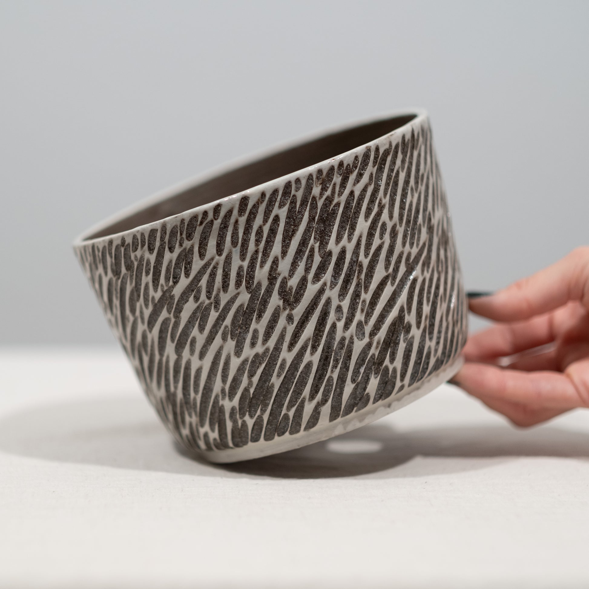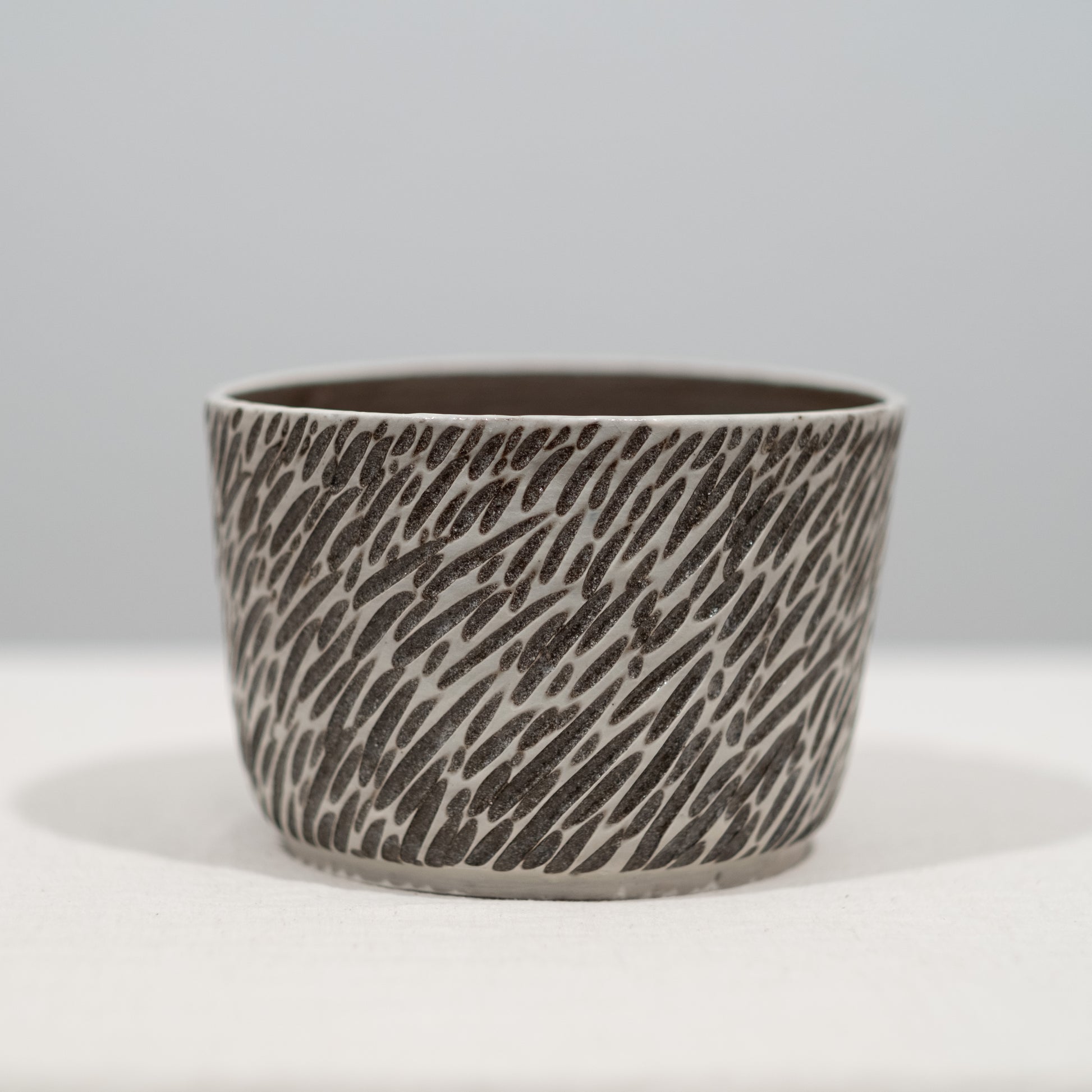 This planter was thrown on the pottery wheel and a grey slip was added. When it was dry enough to handle, the design was carved away using the sgraffito technique, revealing the dark brown clay underneath. It was finished by glazing with a clear coat, then fired in the kiln at 2170°F.