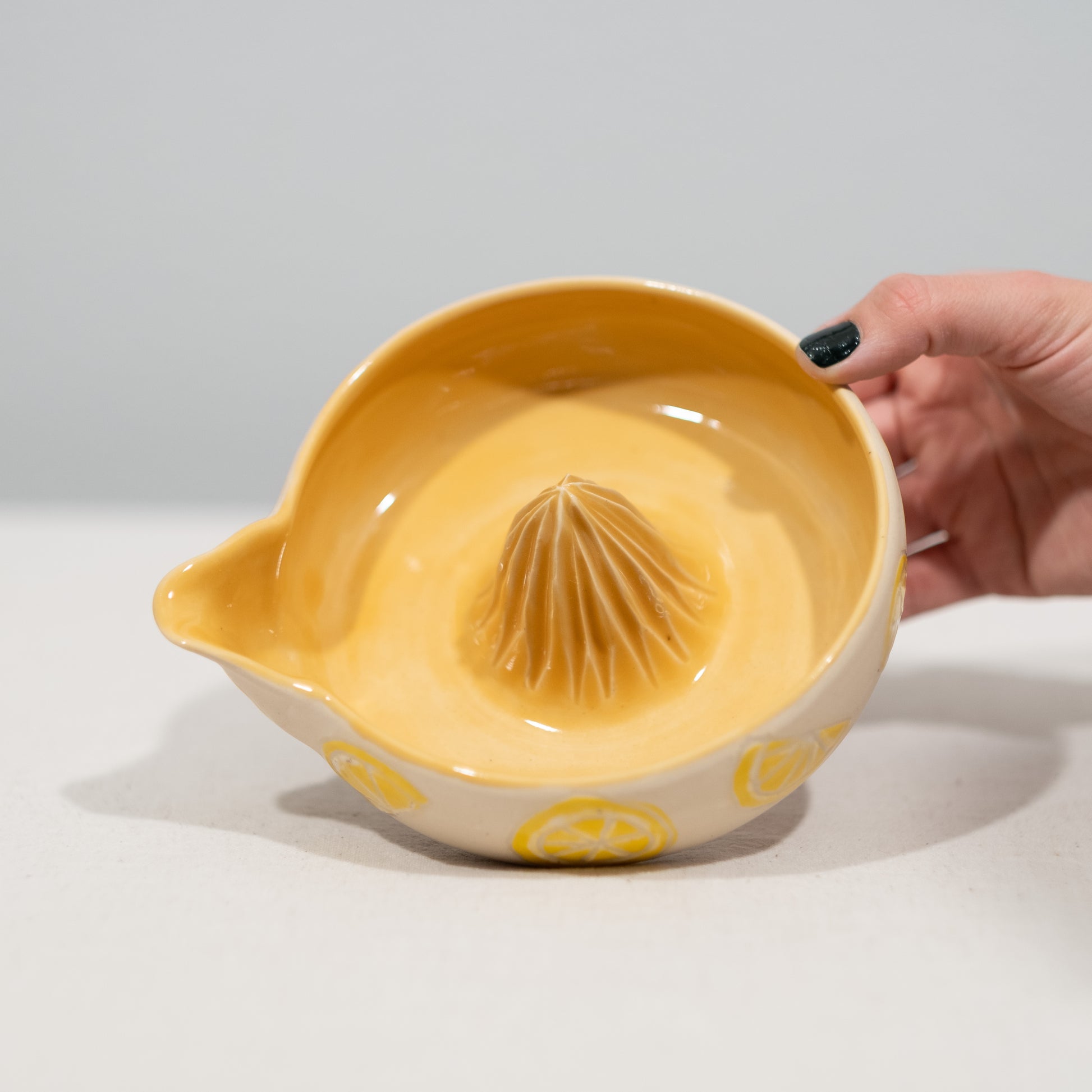 The clay is a warm ivory colored ceramic stoneware, and the lemons are handpainted with yellow and white underglazes. The inside is glazed with a glossy yellow.