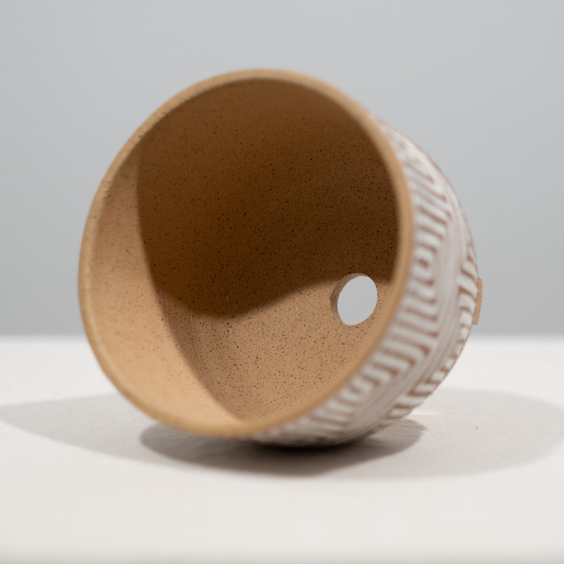 This planter was thrown on the pottery wheel and the design carved by hand, then fired in the kiln at 2170°F.