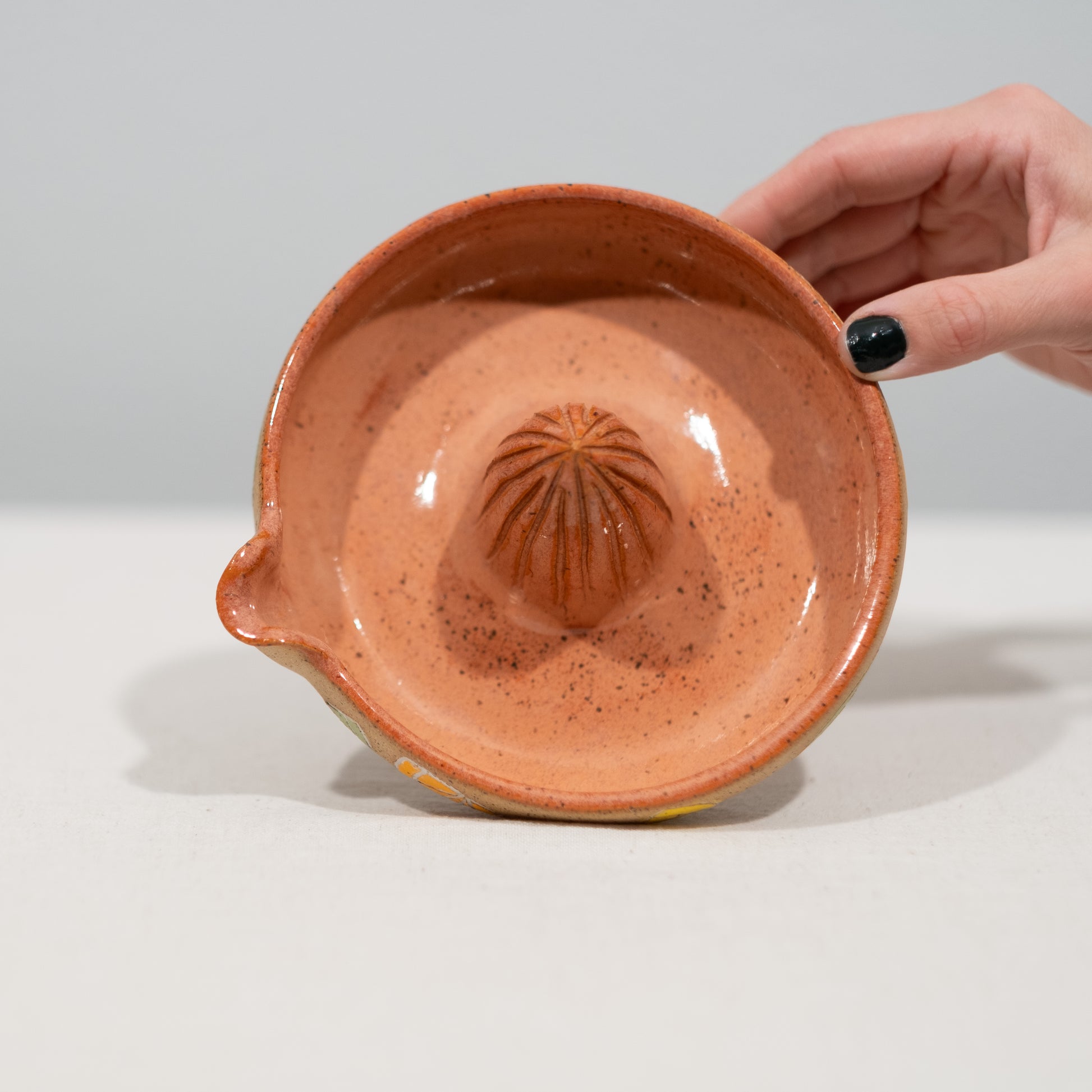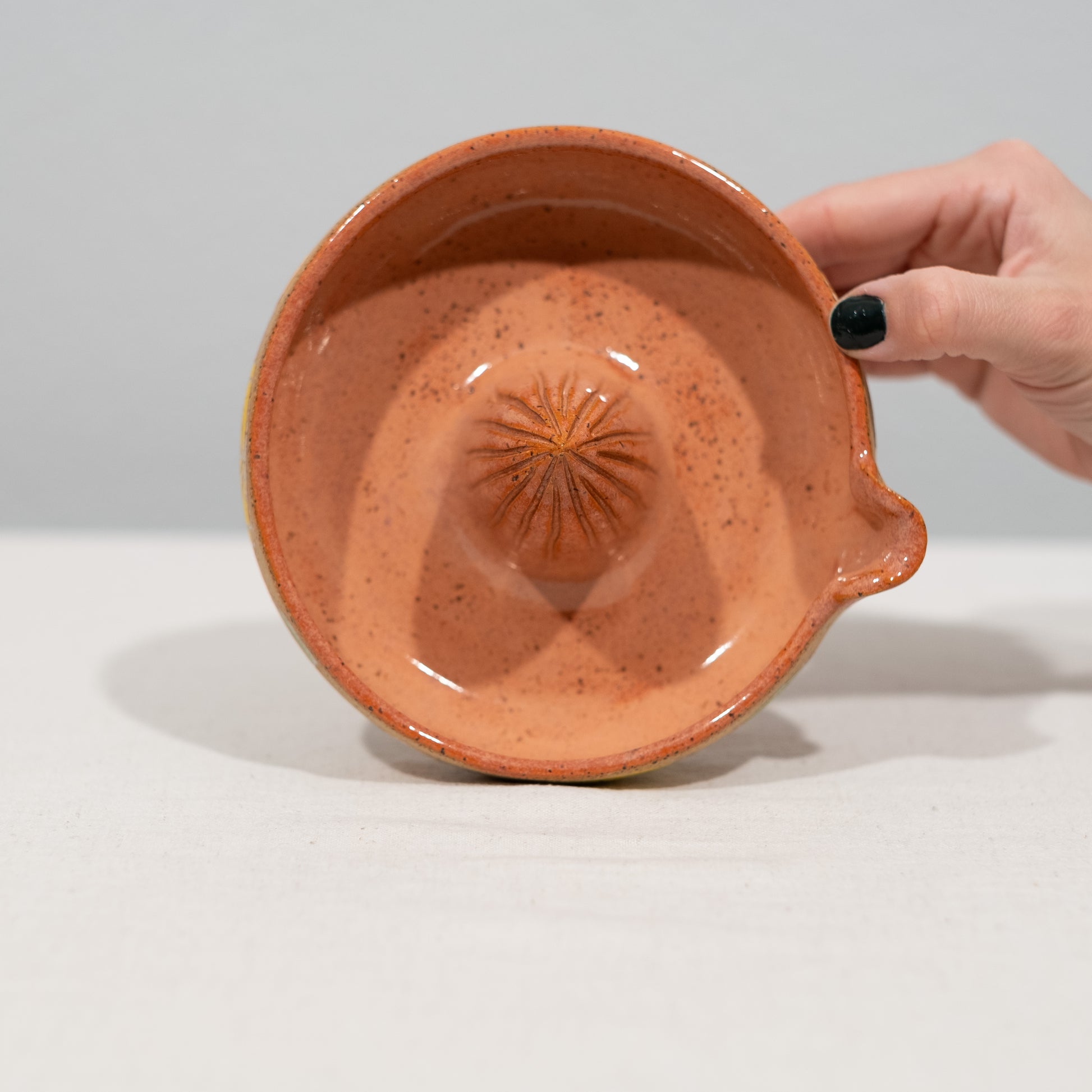 This juicer was thrown on the pottery wheel and the design was created by hand, then fired in the kiln at 2170°F.