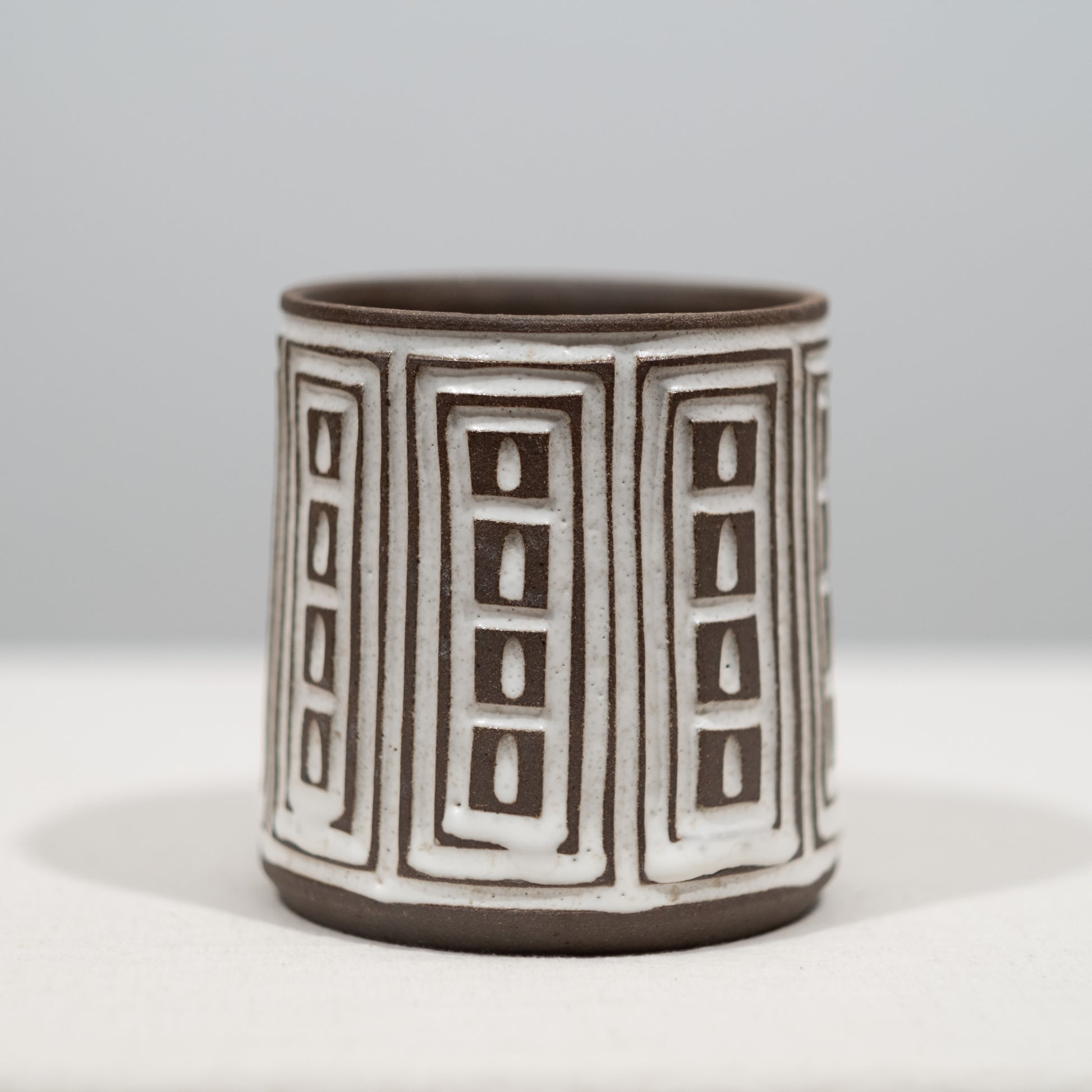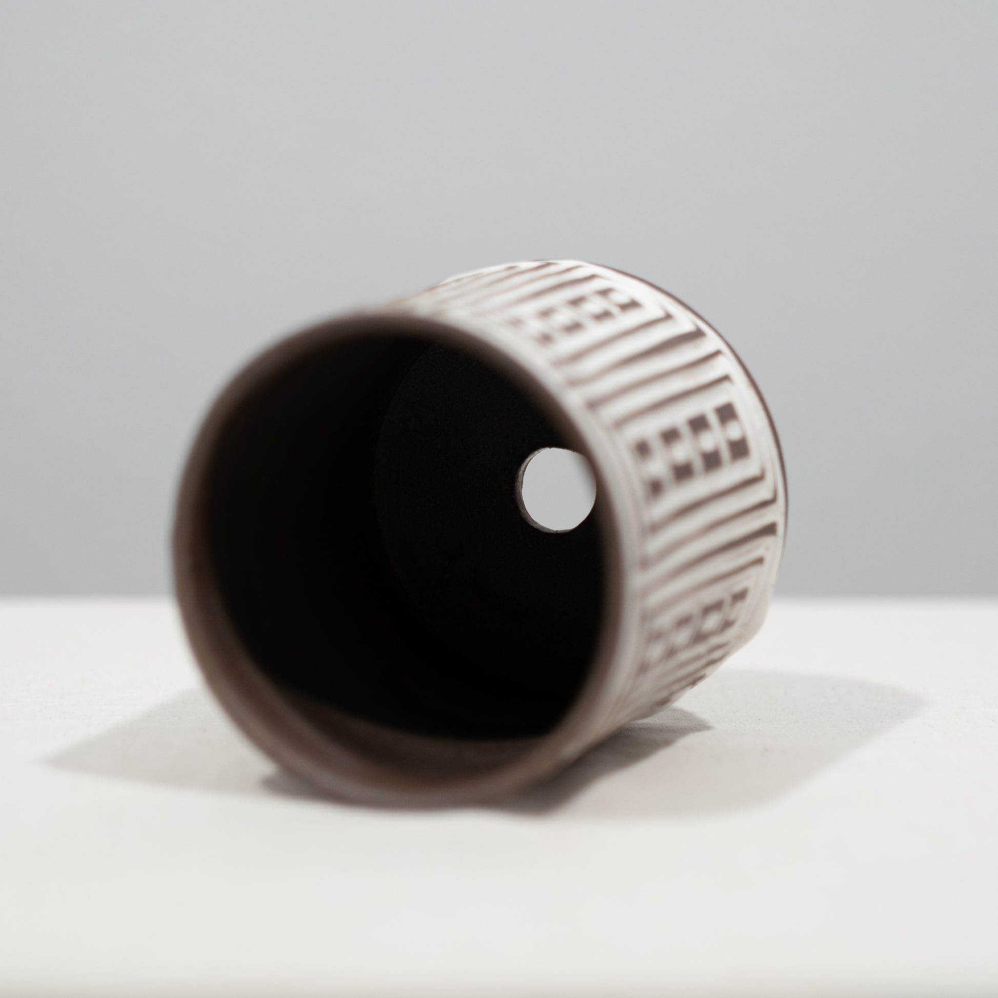 The clay is a dark brown-black ceramic stoneware, with a stark contrasting white glaze in the carved pattern.