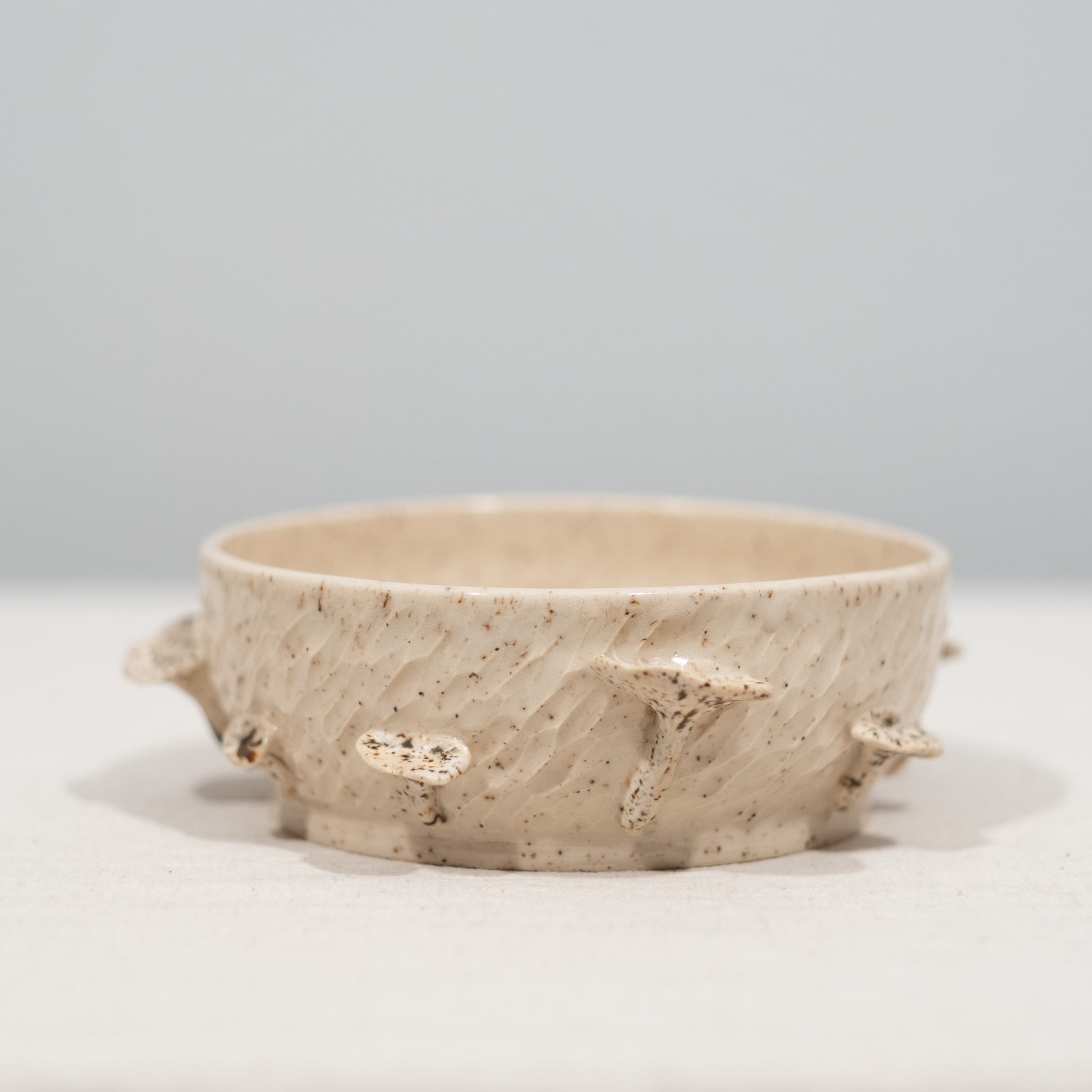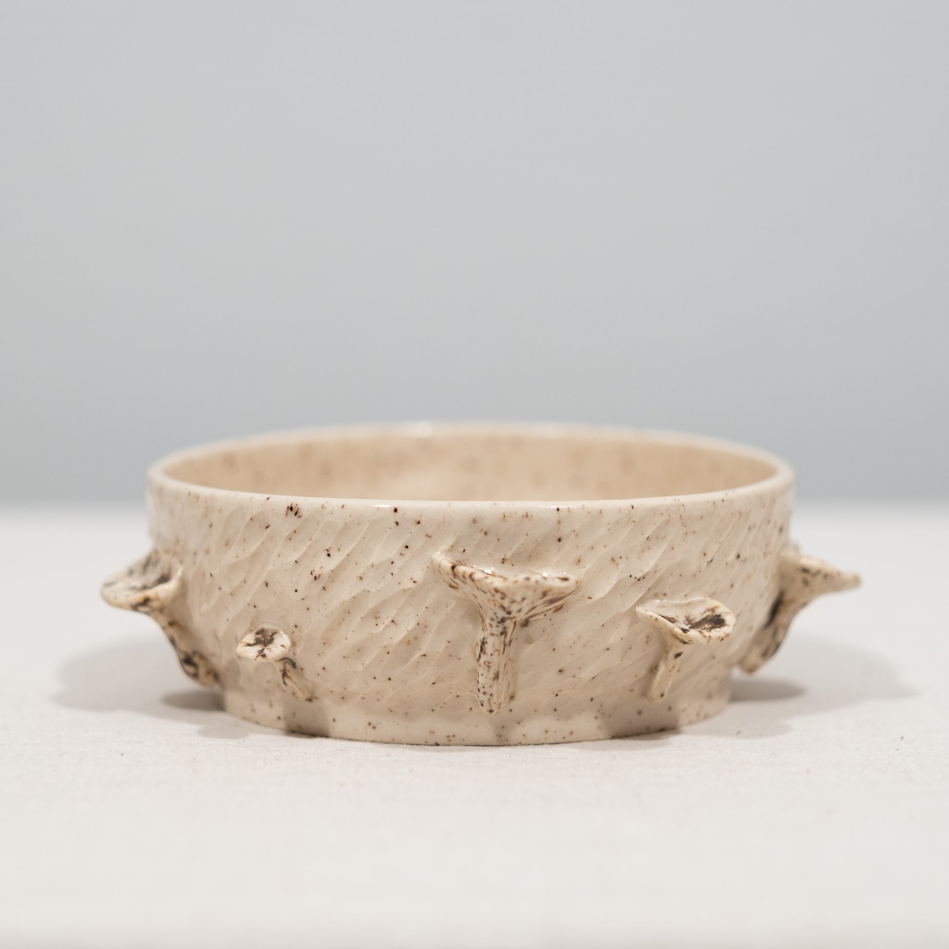 This mushroom bowl was thrown on the pottery wheel, the design was carved out and the mushrooms were individually added by hand, then fired in the kiln at 2170°F.